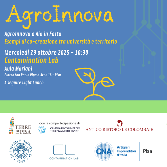 📅Mercoledì 29 ottobre 2025, alle 10:30, nell’Aula Mariani (Piazza San Paolo Ripa d’Arno 16, Pisa) si terrà un nuovo appuntamento del Contamination Lab, stavolta dedicato al progetto AgroInnova e all’esperienza di Aia in Festa del 29 giugno scorso, sviluppato grazie alla collaborazione tra Terre di Pisa, Antico Ristoro Le Colombaie, CNA Pisa e Clab Pisa.